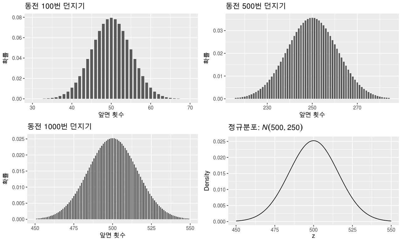 횟수와 확률을 그래프로 표현하면 아래 그림과 같이 나온다. 동전을 100번 던졌을 경우에도 어느정도 정규 분포와 비슷한 모양이 나오지만, 횟수가 500번, 1000번으로 증가할수록 정규 분포와 더욱 유사해진다.
