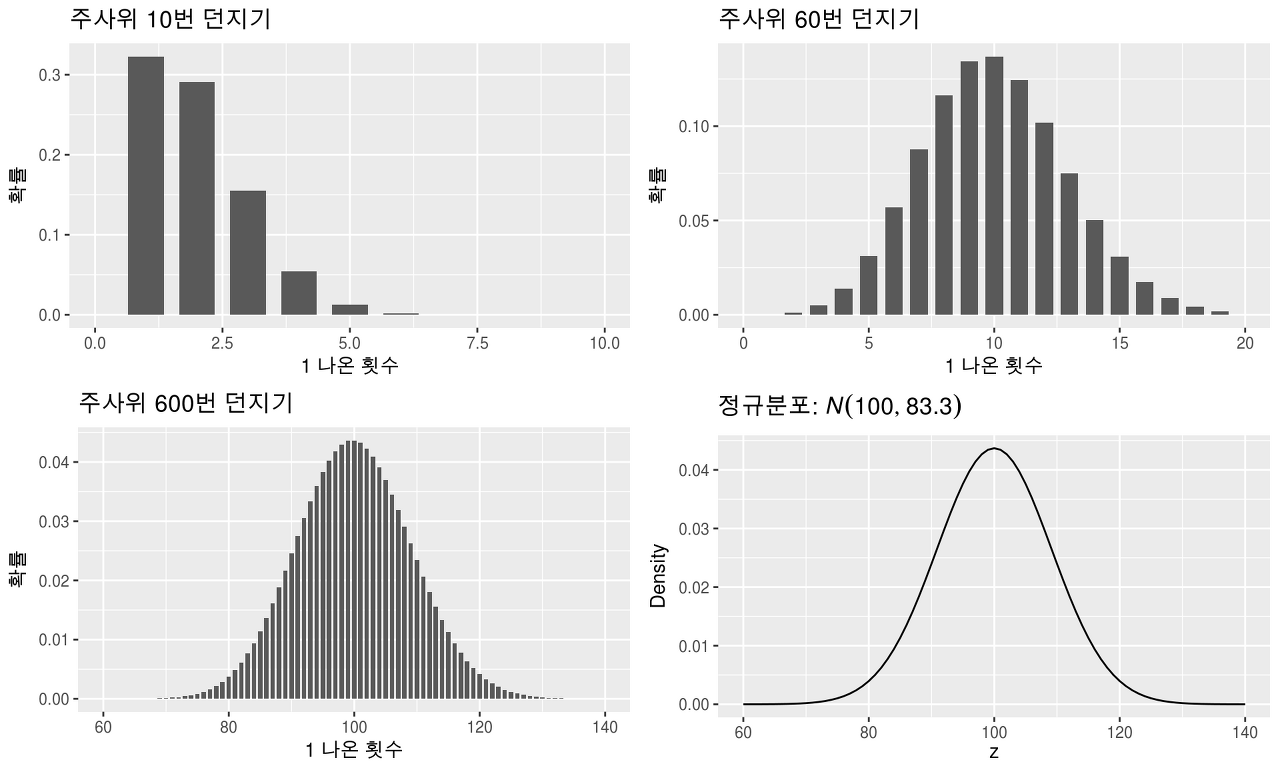 횟수가 늘어날수록 정규분포와 유사해지며, 좌우 대칭이 나온다.