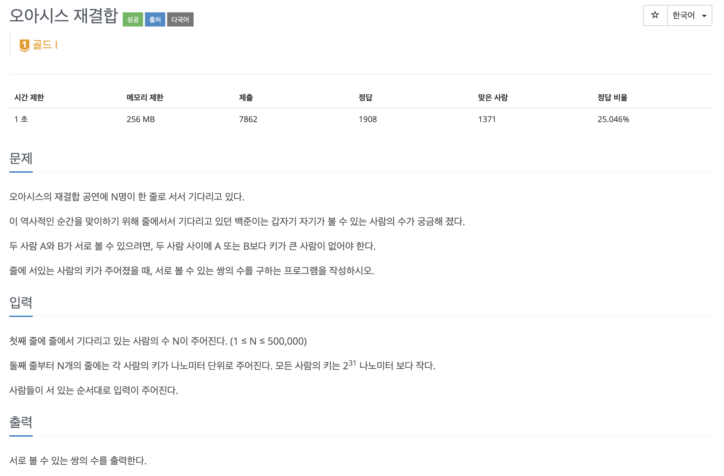 # 스택이 안비었고, 왼쪽 사람보다 키가 작으므로 그 사람만 볼 수 있음 -> 스택에 현재 키를 넣고, answer에 1추가(왼쪽 사람만 볼 수 있으므로)