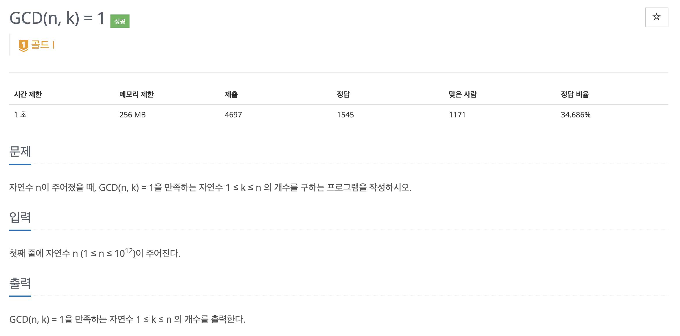 오일러 피 함수를 안다면 쉽게, 모른다면 어떤식으로 풀었을 지 생각이 안나는 문제였다.....